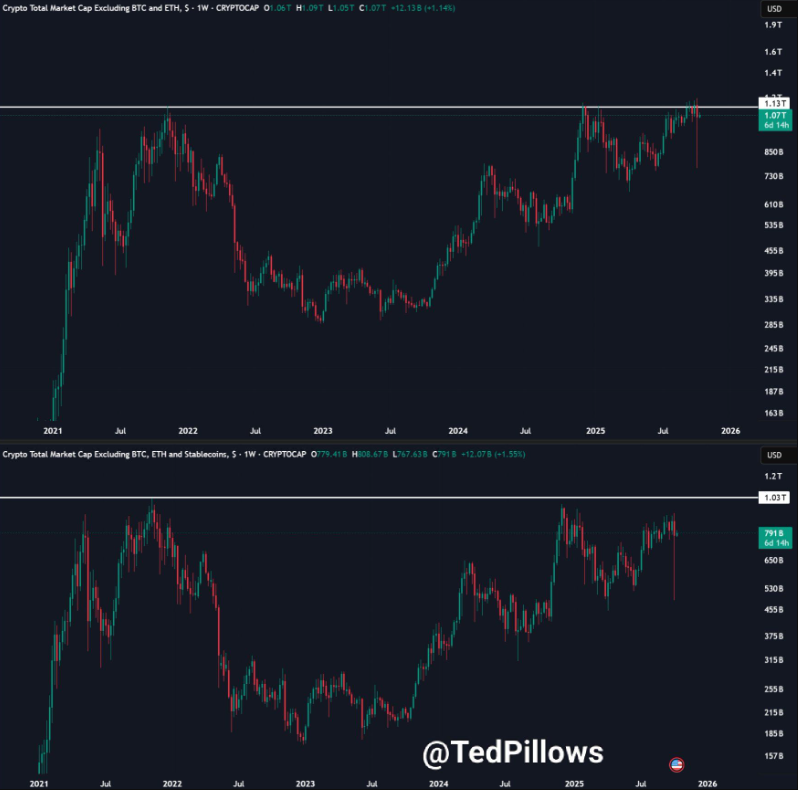 Đồng quan điểm thận trọng, nhà phân tích Ted nhận định rằng thị trường vẫn chưa thực sự bước vào giai đoạn mùa altcoin. Ông chỉ ra rằng tổng vốn hóa của nhóm altcoin (không bao gồm stablecoin) hiện vẫn thấp hơn khoảng 20% so với đỉnh lịch sử — một dấu hiệu cho thấy Bitcoin và Ethereum cần tạo thêm động lực tăng giá mạnh mẽ trước khi làn sóng altcoin có thể bứt phá theo.