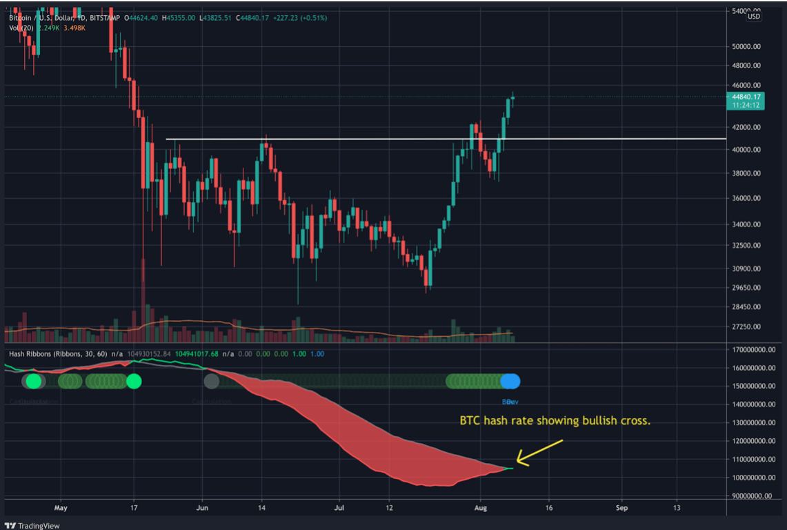 Điều rất thú vị là Chỉ báo Hash Ribbon của BTC đã chuyển sang xu hướng tăng giá vào thời điểm giá đang kiểm tra MA 200 ngày. Hash Ribbon đo lường hashrate của mạng Bitcoin trên đường MA 30 ngày và 60 ngày. Khi MA 30 ngày vượt lên trên MA 60 ngày, điều này báo hiệu thị trường Bitcoin có xu hướng chạm đáy khi các thợ đào đầu hàng – một dấu hiệu cho thấy sức mạnh đang quay trở lại mạng Bitcoin trong hashrate.