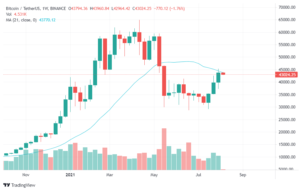 Một mức quan trọng khác cần phải lấy lại để mở rộng đà tăng là MA 21 tuần ở mức $44,5k.