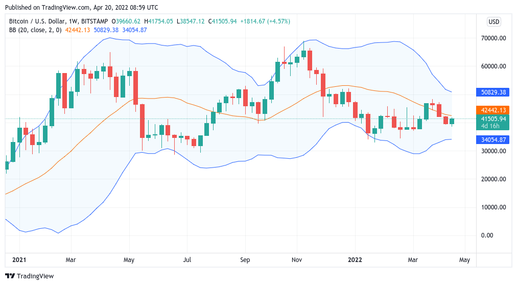 Biểu đồ nến BTC/USD 1 tuần và dải Bollinger | Nguồn: TradingView