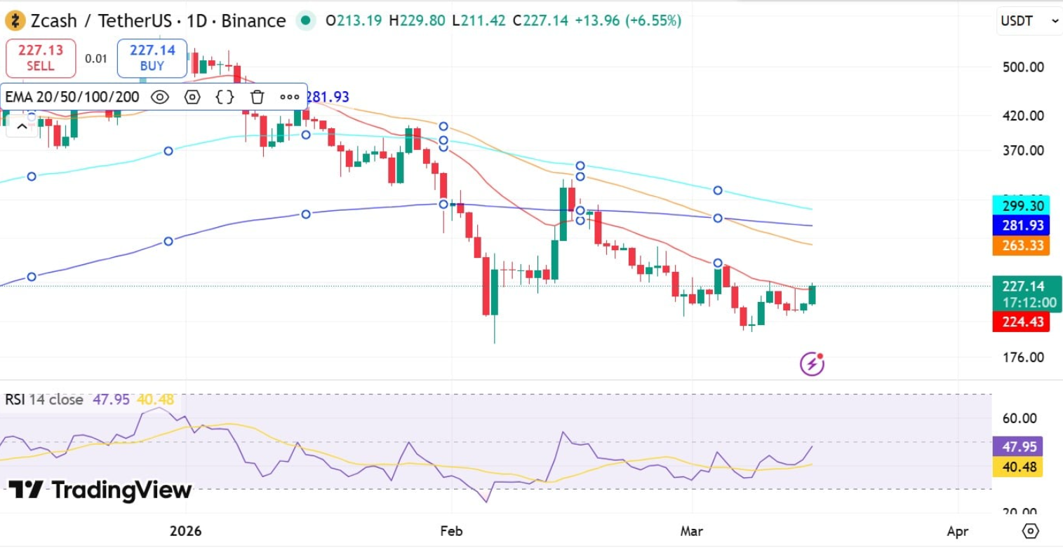 Tại thời điểm viết bài, ZEC được giao dịch ở mức 226 USD, tăng 9,26% trong vòng 24 giờ. Đáng chú ý, trong nhịp tăng này, giá đã vượt lên trên đường trung bình động hàm mũ (EMA) 20 ngày, tín hiệu cho thấy động lực tăng đang dần được cải thiện và phe bò bắt đầu giành lại ưu thế ngắn hạn.