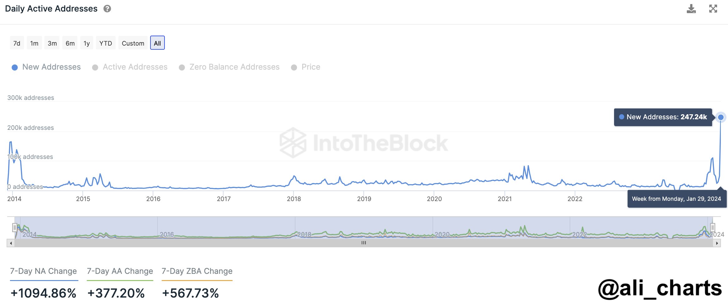 Nhà phân tích Ali Martinez đã chia sẻ dữ liệu từ IntoTheBlock, cho biết DOGE đã đạt được kỷ lục về lượng địa chỉ mới được tạo vào ngày 29/1. Martinez nhấn mạnh rằng “số lượng địa chỉ mới đã tăng hơn 1.100% chỉ trong tuần qua”, hiện nằm ở hơn mức 247.240 địa chỉ.