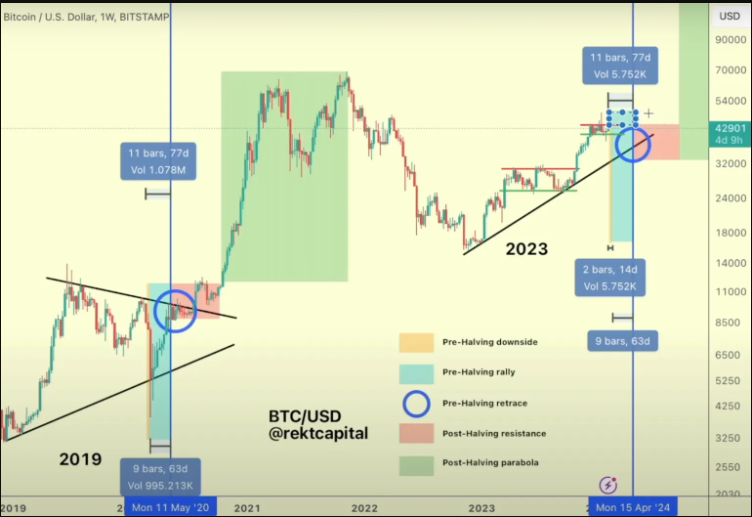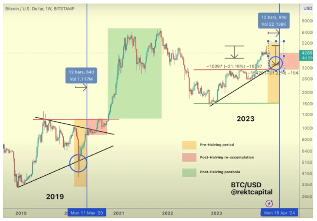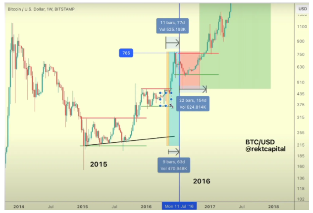 Trader Rekt Capital nói với 53.700 người đăng ký YouTube của mình rằng, Bitcoin có thể sẽ lặp lại mô hình năm 2016 và tăng giá trước đợt halving BTC vào giữa tháng 4, khi phần thưởng của thợ đào giảm đi một nửa.