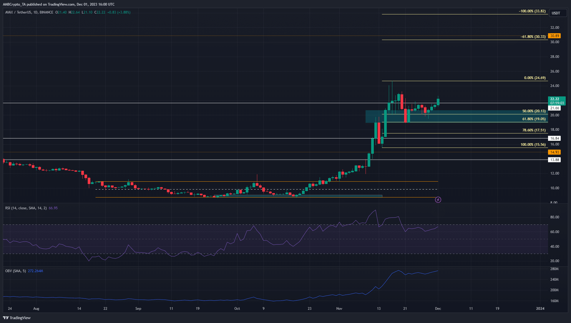 Một đợt giảm giá đã xảy ra vào ngày 21/11, đưa AVAX kiểm tra lại mức thoái lui Fibonacci 61,8% (màu vàng nhạt). Kể từ đó, giá đã tăng vượt mốc $ 20.