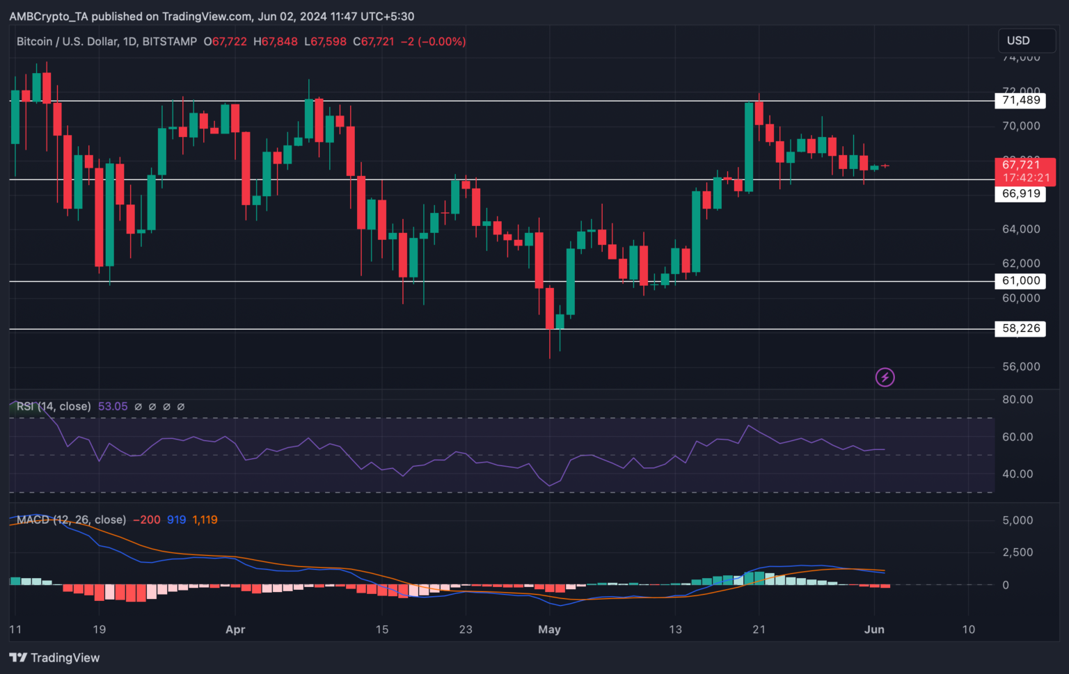 Tuy nhiên, BTC tiếp tục giao dịch trên mức hỗ trợ $ 66.900, cho thấy giá có thể tăng vọt trong những ngày tới.