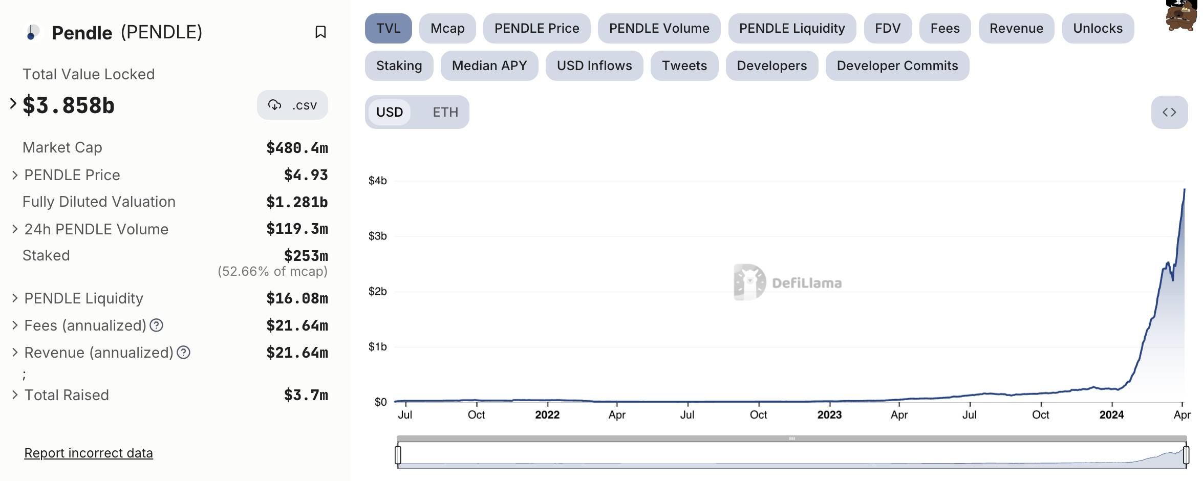 Pendle đã nhanh chóng được hưởng lợi từ chiến dịch airdrop, Sats Campaign của dự án stablecoin phi tập trung Ethena, khi hoạt động trên giao thức này đã đạt ngưỡng 3,9 tỷ USD, tăng đến 40% trong hai tuần qua.