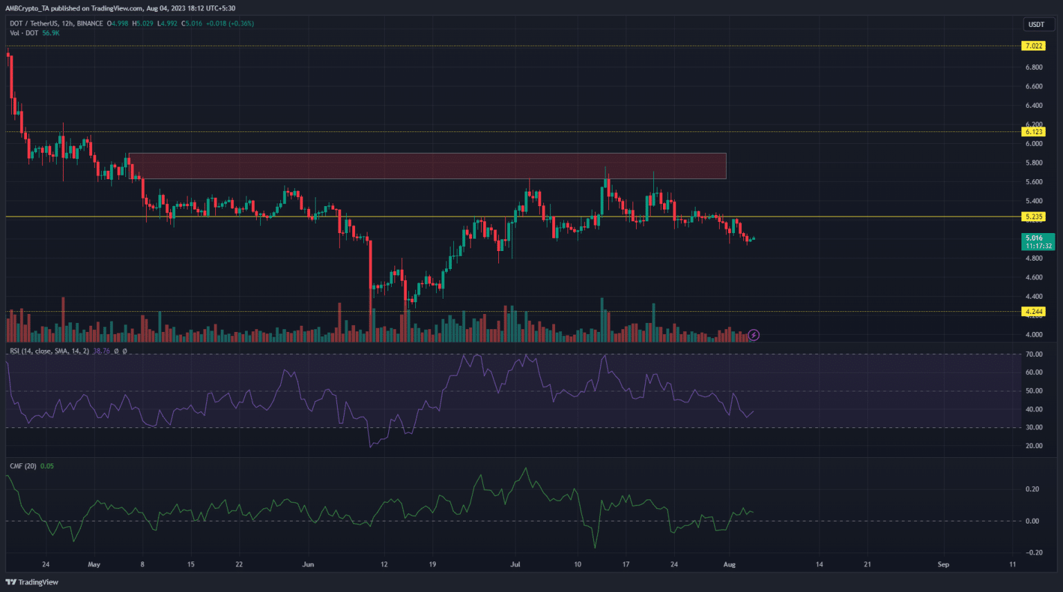 Việc Polkadot (DOT) xuống dưới mức hỗ trợ $ 5,23 đã kết thúc sự hình thành phạm vi kéo dài một tuần trên biểu đồ giá 12 giờ. Tuy nhiên, áp lực bán đã chậm lại, khiến giá ổn định ngay bên dưới mức tâm lý $ 5 và mang đến cho phe bò cơ hội tốt để phục hồi.
