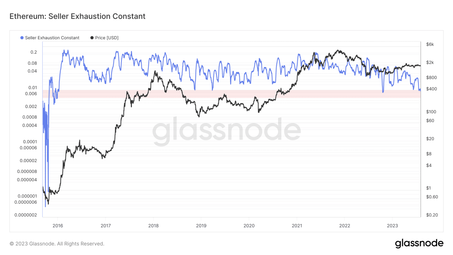 Trong 7 ngày qua, ETH đã dao động quanh mức $ 1.835 và không thể đạt $ 1.900. Dữ liệu của Glassnode, chỉ báo Seller Exhaustion Constant của ETH đã giảm xuống còn 0,097. Chỉ báo này là sản phẩm của sự biến động giá trong 30 ngày và nguồn cung ETH đang sinh lợi nhuận.