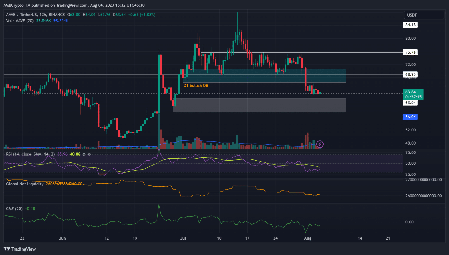 AAVE đã giảm từ $ 88 xuống còn khoảng $ 63 kể từ giữa tháng 7, với mức lỗ 25%. Với việc BTC dao động sát $ 29.000, càng củng cố khả năng giảm vào cuối tuần cho các altcoin.