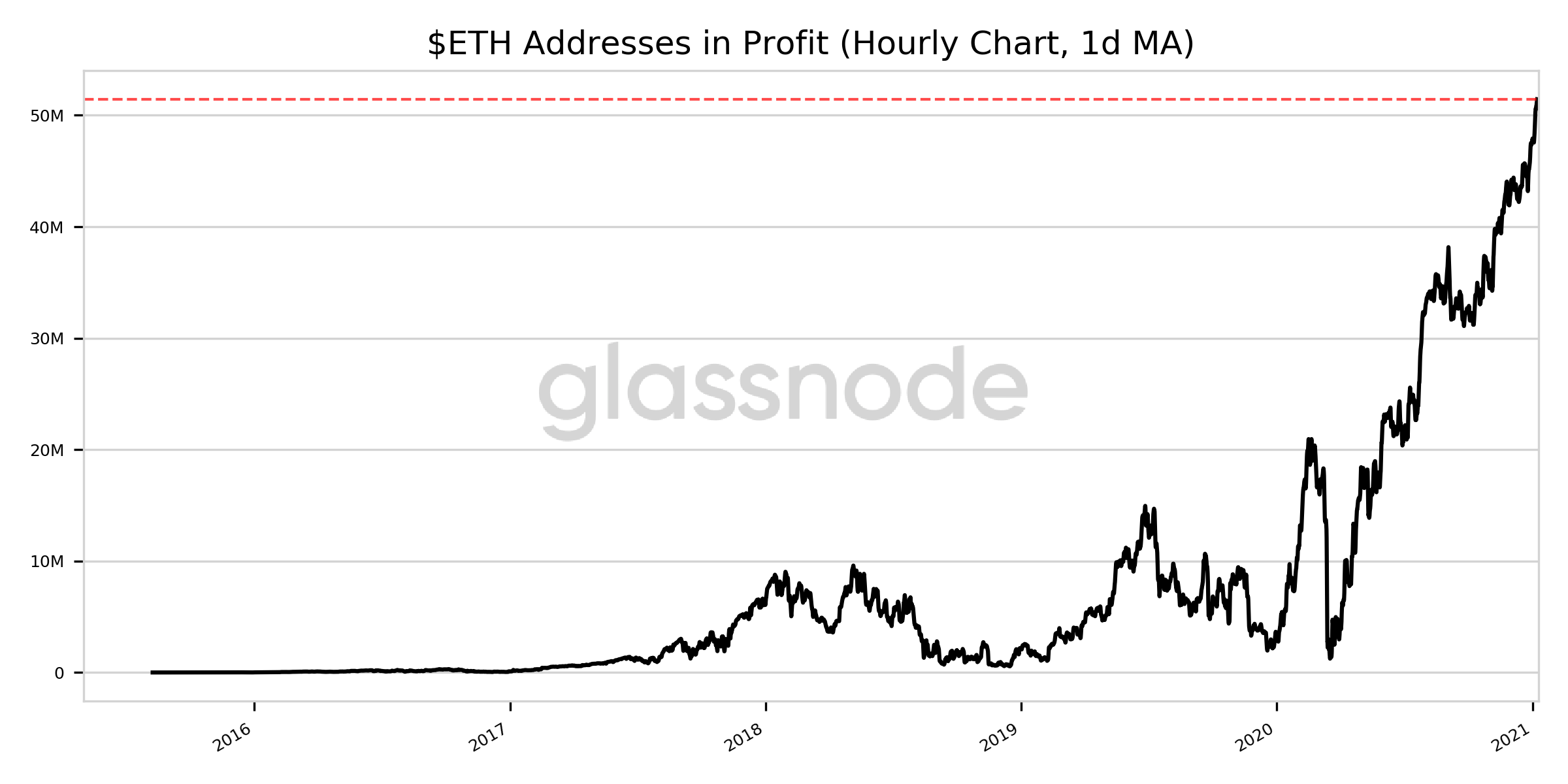 Trong khi giá ETH gần quay về ATH 2018 là 1,400 đô la, thì các địa chỉ có lợi nhuận vừa đạt ATH là 51.442.455.250, theo Glassnode.