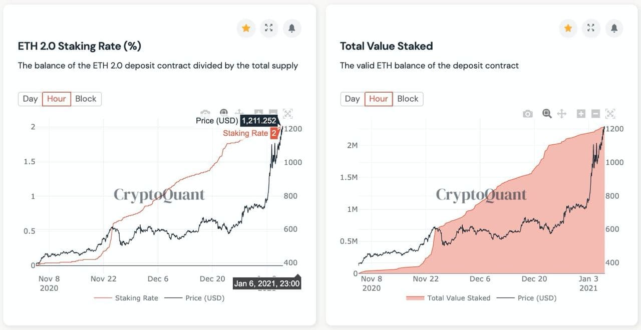 Theo công ty phân tích on-chain CryptoQuant, 2% của nguồn cung ETH hiện được đặt trong hợp đồng tiền gửi ETH 2.0. Tổng giá trị staking là 2,29 triệu ETH, trị giá 2,75 tỷ đô la.