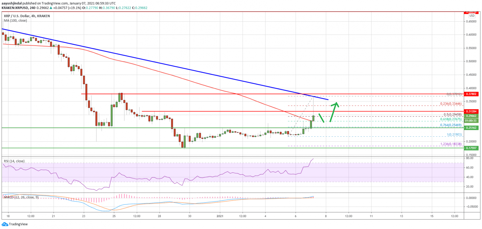 Giá đã phá vỡ các mức kháng cự $ 0,2450 và $ 0,2500 để bắt đầu tăng mạnh. Có giá đóng cửa trên mức 0,2500 đô la và mức trung bình động MA 100 (4 giờ). Phe bò đã đạt được sức mạnh và họ có thể đẩy giá lên trên mức 0,3000 đô la.