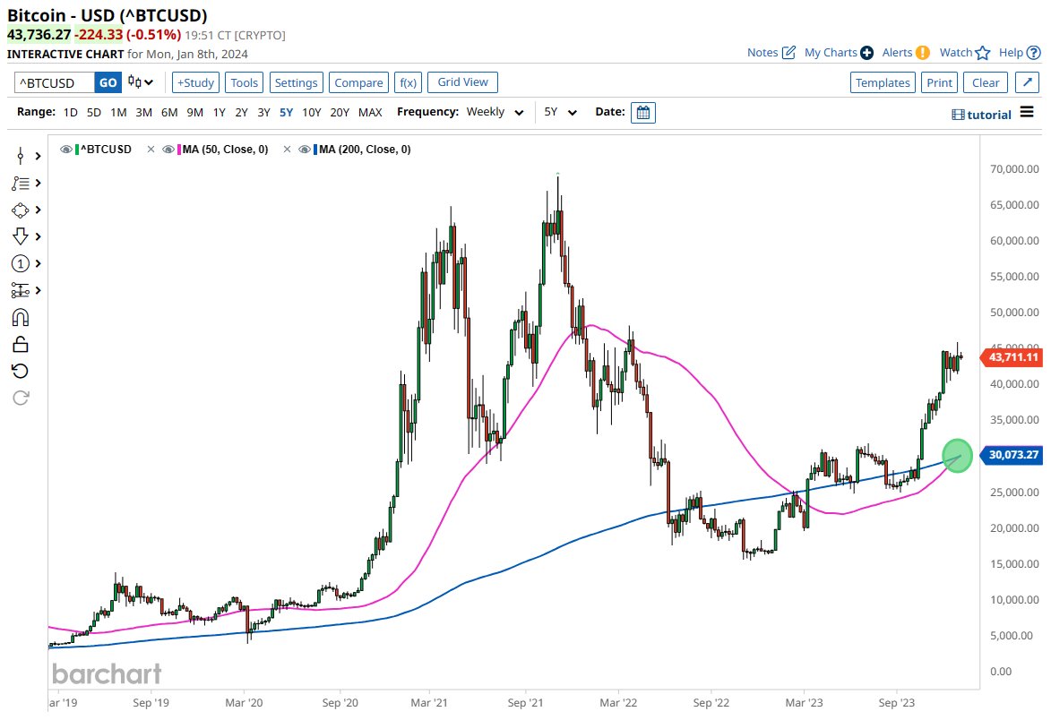 Bitcoin (BTC) vừa ghi nhận mô hình cực kỳ tăng giá. Theo dòng tweet từ Barchart, tiền điện tử hàng đầu theo vốn hóa thị trường đã hình thành mô hình mà giới trader gọi là “golden cross” trên biểu đồ hàng tuần.
