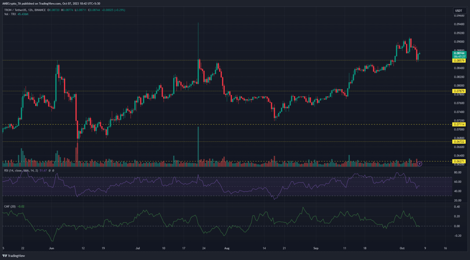 Mức giảm 5% so với vùng giá $ 0,09 đã đưa TRX xuống mức hỗ trợ gần đó là $ 0,0857. Bất chấp sự phục hồi khỏi mức này, chỉ báo RSI và CMF (Chaikin Money Flow) cho thấy áp lực bán ngày càng tăng.