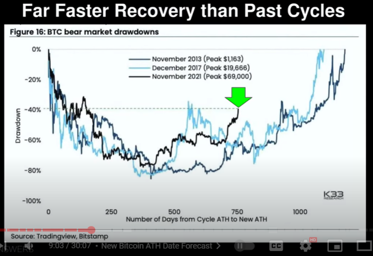 Người dẫn chương trình InvestAnswers, trích dẫn biểu đồ từ công ty tình báo thị trường K33 Research, lưu ý rằng Bitcoin đang phục hồi nhanh hơn so với các chu kỳ trước đây.