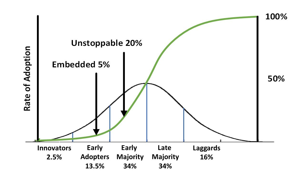 Đường cong chữ S, trong trường hợp này, được sử dụng để hình dung quỹ đạo của việc áp dụng một công nghệ, thường bắt đầu chậm trước khi tăng tốc nhanh chóng và cuối cùng đạt đến trạng thái cân bằng.