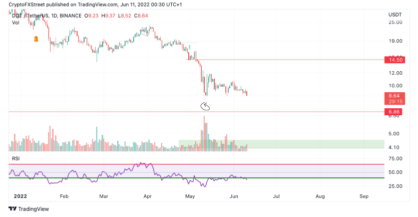 DOT, giống như một số loại tiền điện tử khác, đã bị từ chối bởi mức hỗ trợ tăng giá trên Chỉ số RSI. Điều này có thể khiến token giảm xuống còn $ 5.
