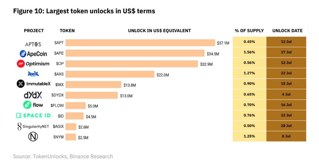 Khoảng thời gian còn lại của tháng 7 sẽ chứng kiến khoảng 168 triệu đô la giá trị các token sẽ được giải phóng ra thị trường. Như được hiển thị trong hình bên dưới, đợt mở khóa lớn nhất trong phần còn lại của tháng là Aptos (APT) giải phóng 0,45% nguồn cung trị giá 37,1 triệu đô la vào ngày 12/7. Tiếp theo là Apecoin (APE) mở khóa 1,56% nguồn cung (34,5 triệu đô la) vào 17/7; Optimism (OP) mở khóa 0,56% nguồn cung (32,9 triệu đô la) vào 12/7; Axie (AXS) mở 1,27% nguồn cung (22 triệu đô la) vào 22/7; Immutable (IMX) mở 0,9% nguồn cung (13,8 triệu đô) vào 15/7 cùng Flow, SpaceID và SingularityNET.