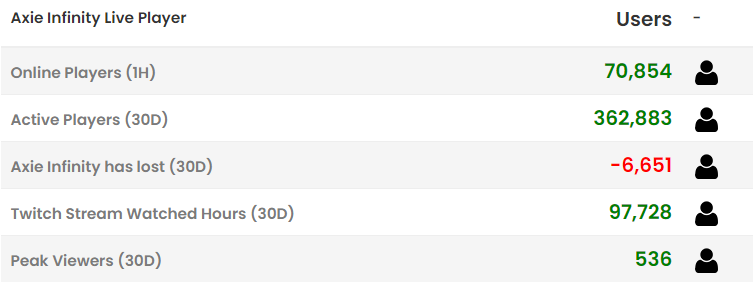 Thay vì thêm các game thủ mới, Axie Infinity đã mất hơn 6.600 người dùng trong 30 ngày qua, theo trang web dữ liệu gaming Activeplayer.
