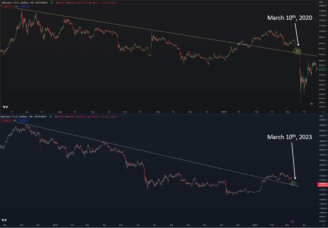Theo trader, hành động giá gợi nhớ đến cách mà Bitcoin di chuyển vào đầu năm 2020 khi nó tăng từ khoảng 6.000 USD lên 10.000 USD và sau đó quay trở lại mức 3.000 USD vào tháng 3 cùng năm.