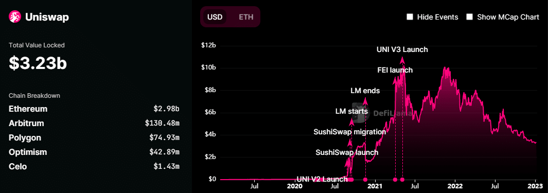 Cần lưu ý ở đây rằng TVL của PancakeSwap đã giảm đáng kể trong ba năm qua. Nó đạt đỉnh khoảng 7,8 tỷ USD vào thời kỳ đỉnh cao của thị trường tăng giá năm 2021.