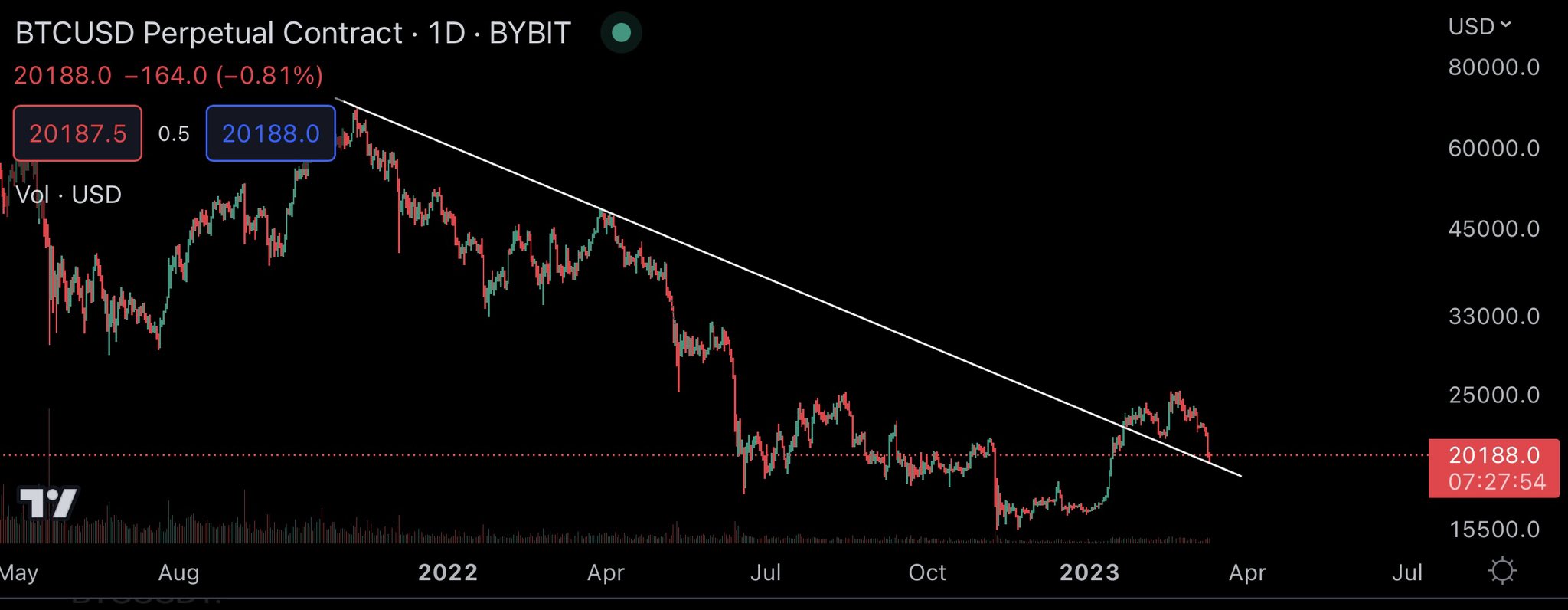 Nhà phân tích Kaleo nói với 566.300 người theo dõi trên Twitter của mình rằng, Bitcoin hiện đang tích lũy bên trên đường xu hướng chéo sau khi di chuyển bên dưới mức này vào đầu năm nay.