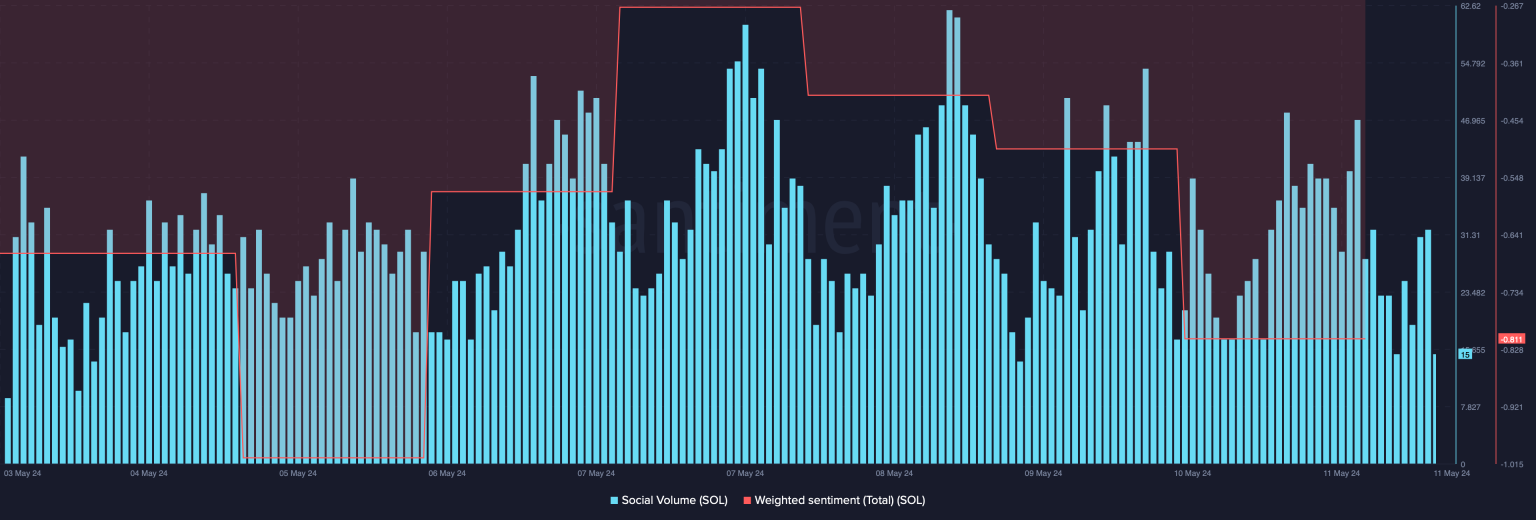 Vì vậy, tâm lý giảm giá xung quanh SOL chiếm ưu thế trên thị trường. Chỉ báo Social Volume của nó cũng giảm, cho thấy mức độ phổ biến của token trong không gian đã giảm xuống.