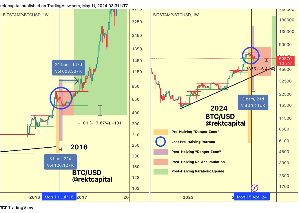 Từ biểu đồ mà Rekt Capital chia sẻ, ông giải thích cách mà BTC đã thỏa mãn sự điều chỉnh sau halving và trong hai ngày nữa, Bitcoin có thể đã hoàn toàn rời khỏi khu vực nguy hiểm.