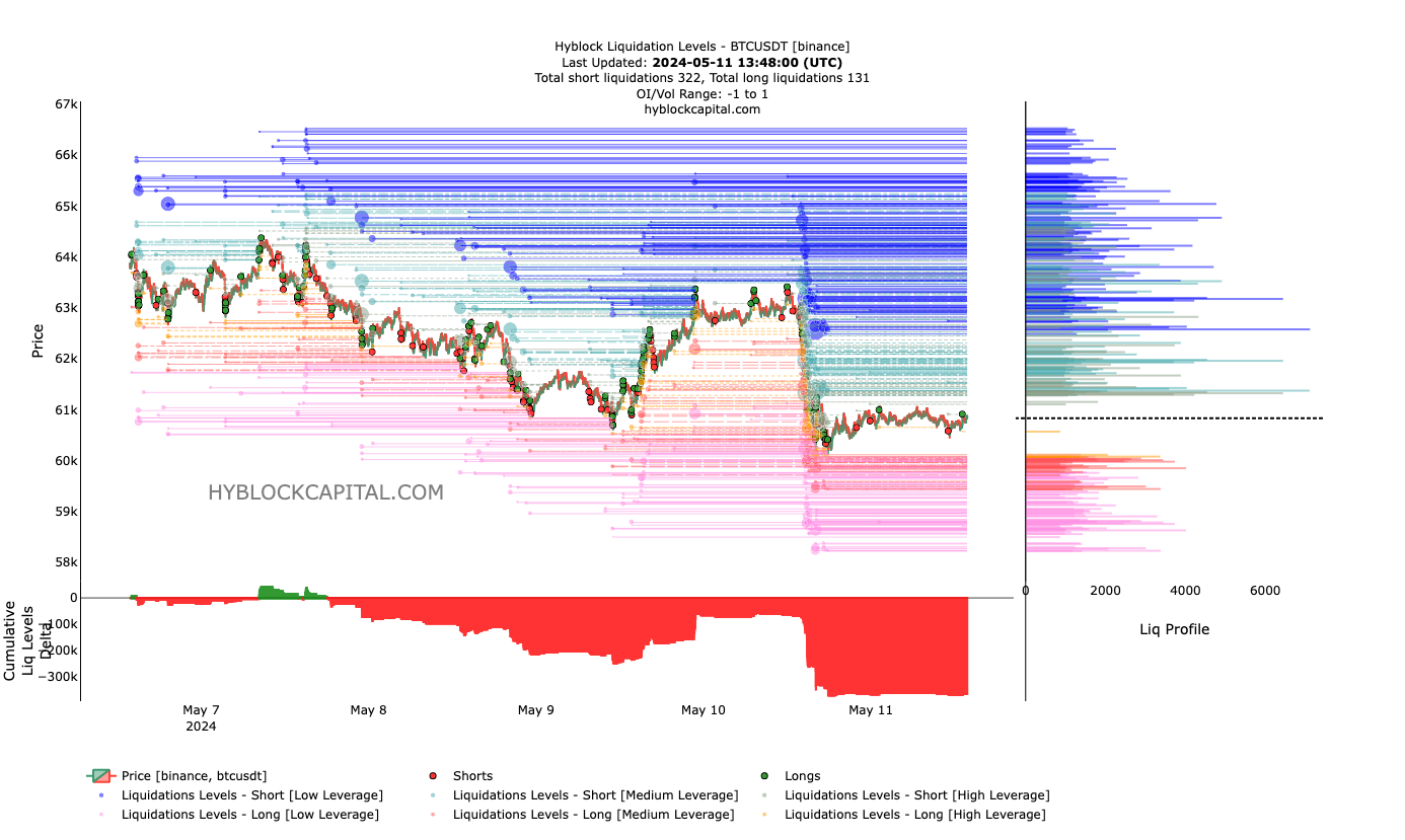 Sử dụng dữ liệu từ Hyblock, có một vùng từ tính xung quanh các mức thanh lý. Chỉ báo này cho thấy mức giá mà trader có nguy cơ bị thanh lý.