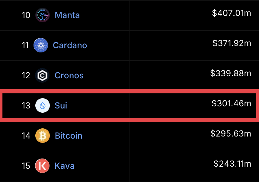 Theo dữ liệu từ DefiLlama, Sui Network (SUI), blockchain Layer-1 được thiết kế để giúp mọi người sở hữu tài sản kỹ thuật số nhanh chóng, riêng tư, an toàn và có thể truy cập được, đã có tổng giá trị tài sản bị khóa (TVL) vượt qua BTC và hiện đứng thứ 13 trong số tất cả các chuỗi.