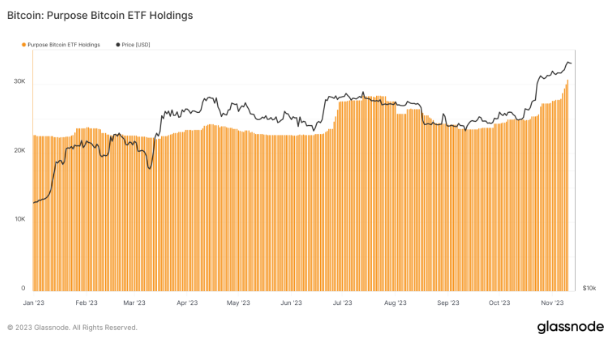 Trong khi đó, số lượng nắm giữ của Purpose Bitcoin ETF gần đây đã vượt cột mốc quan trọng là 30.000 Bitcoin, lần đầu tiên kể từ vụ sụp đổ của Luna vào tháng 6 năm 2022.
