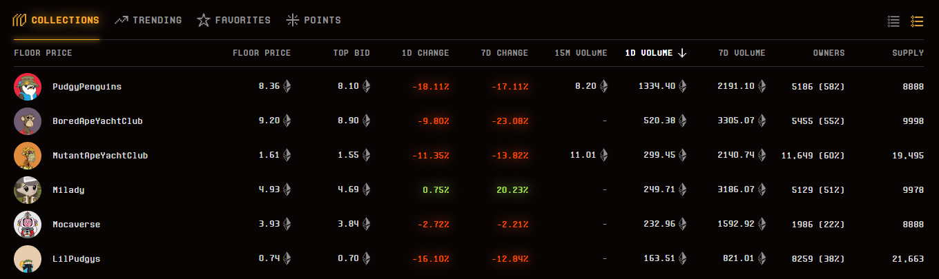 Theo Blur, giá NFT đã giảm mạnh trong 24 giờ qua, với BAYC và Pudgy Penguins đều giảm xuống dưới 10 ETH.