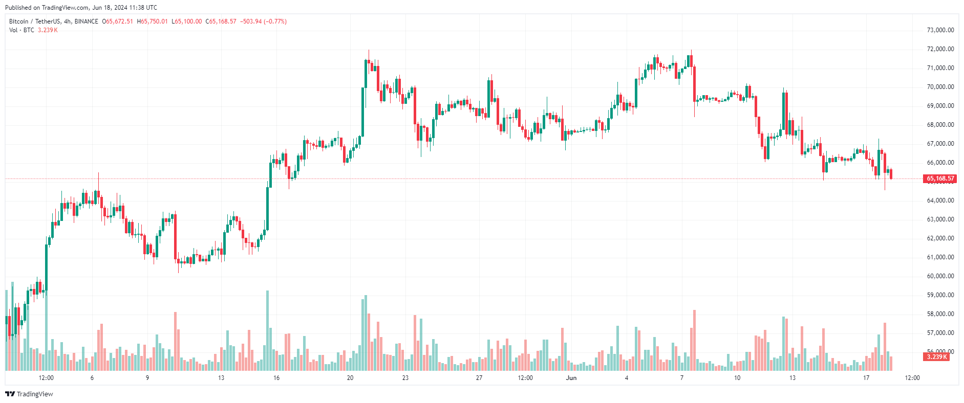 Tài sản hàng đầu đã có một ngày cuối tuần yên tĩnh khi dao động quanh $ 66.000. Thị trường bắt đầu đạt được lực kéo vào cuối ngày thứ Hai, khi BTC nhảy lên mức đỉnh cục bộ $ 67.200 trước khi phe gấu nắm quyền kiểm soát hoàn toàn thị trường và bắt đầu một đợt giảm giá mạnh.