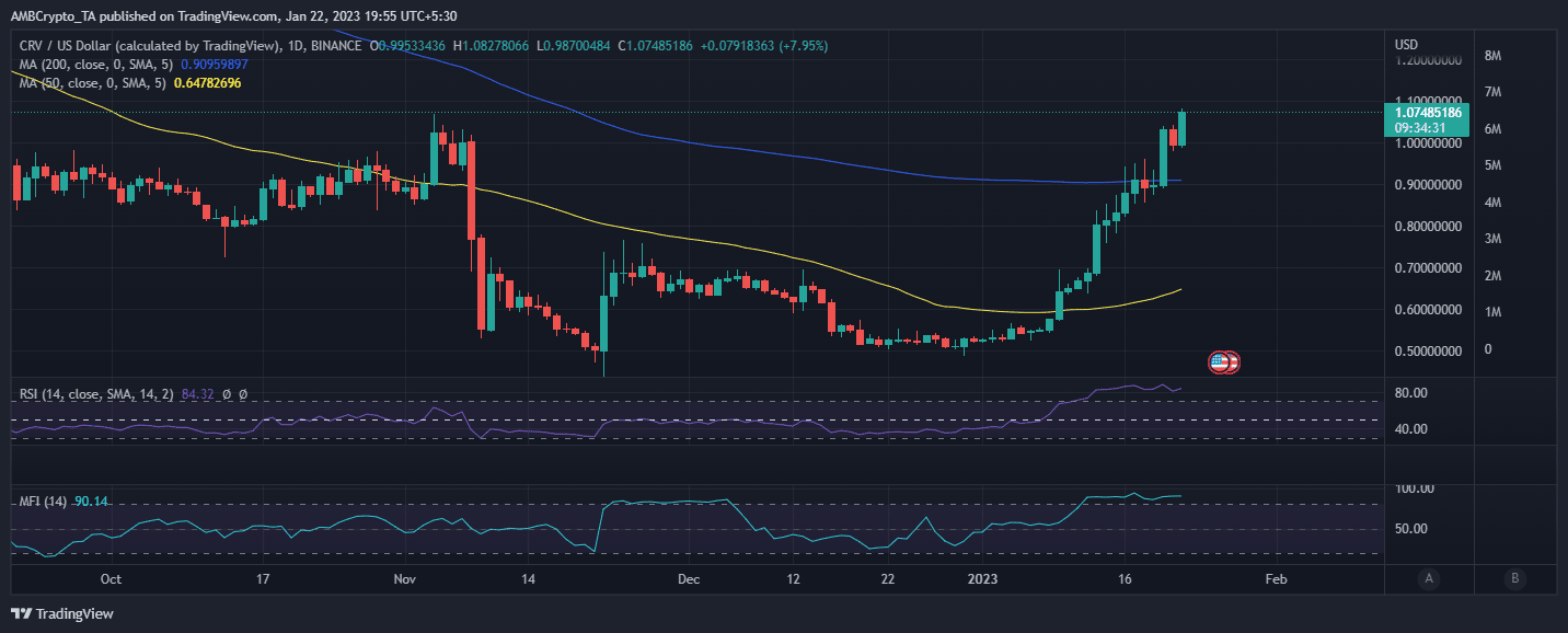 CRV được giao dịch ở mức cao hơn 120% so với giá thấp nhất vào cuối tháng 12/2022, đưa nó trở thành một trong những altcoin tăng trưởng mạnh mẽ nhất trong số các loại tiền điện tử lớn. Tuy nhiên, bản chất quá mua của CRV có thể tạo ra một số áp lực bán.