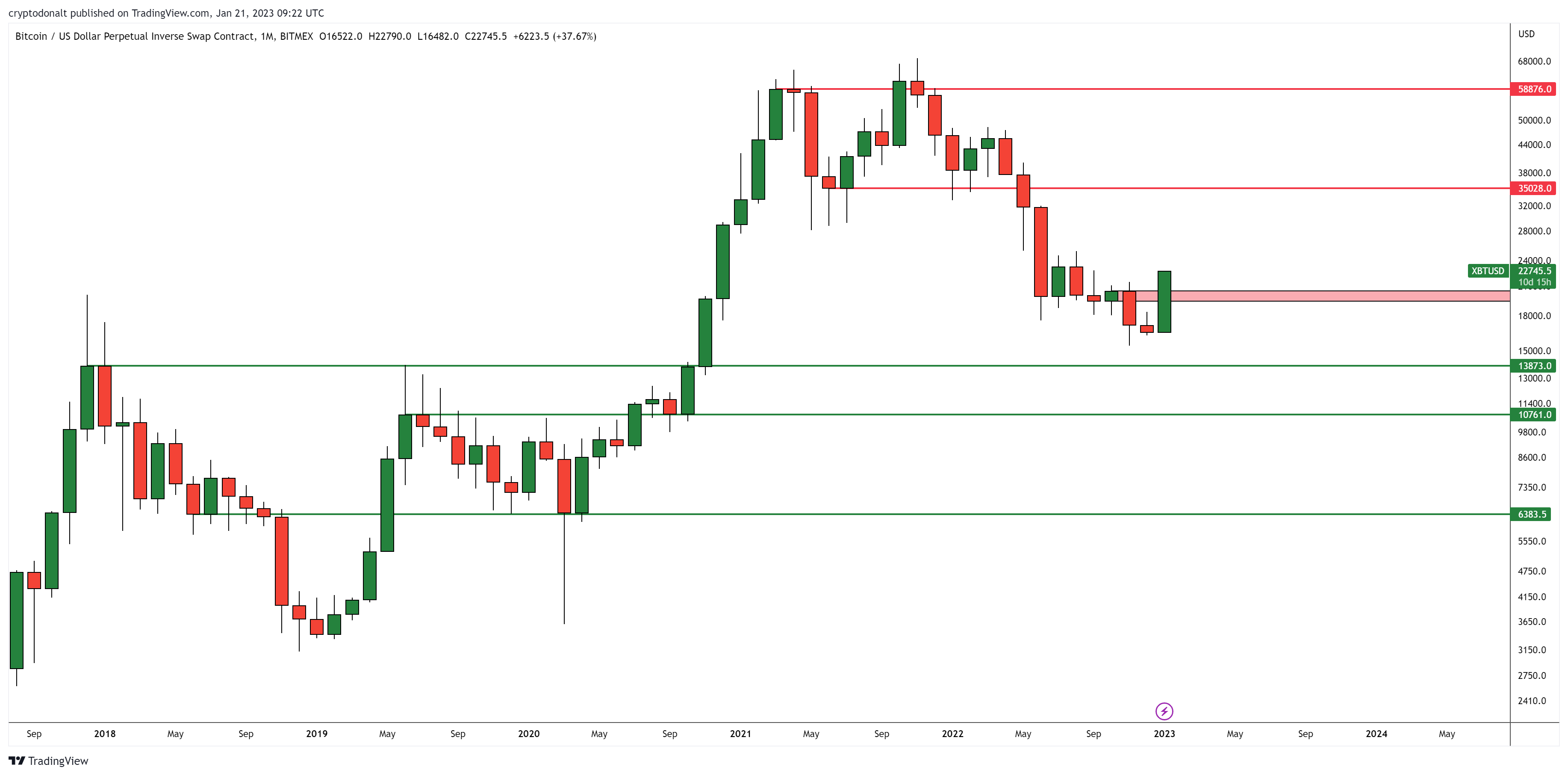 Nhìn vào biểu đồ của trader, mức đóng cửa hàng tháng trên $ 20.000 sẽ là xu hướng tăng giá trong khung thời gian dài hạn đối với Bitcoin. Nếu thị trường kết thúc tháng với đà tăng trưởng, các mức kháng cự trong khung thời gian lớn hơn của DonAlt sẽ là khoảng $ 35.000 và sau đó là $ 58.800.