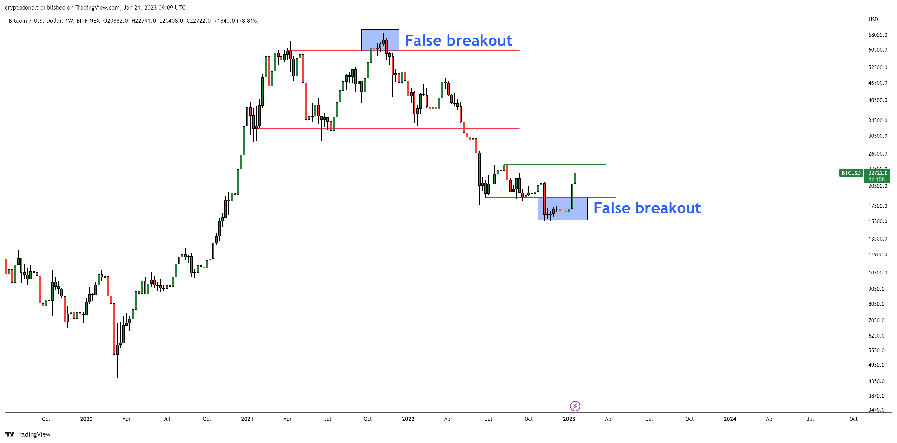 Chiến lược gia cũng chỉ ra rằng, đợt tăng giá hiện tại của Bitcoin trên $ 20.000 trông tương tự như đỉnh của BTC ở mức $ 69.000. Trong cả hai trường hợp, Bitcoin đã tạo ra các thiết lập false breakout.