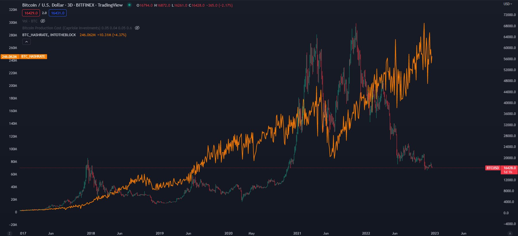 “Một trong những biểu đồ ấn tượng nhất hiện có là Bitcoin hashrate. Sau hơn một tháng giao dịch dưới $ 20.000, vẫn chưa có bất kỳ sự đầu hàng thực sự nào đối với những thợ đào”.