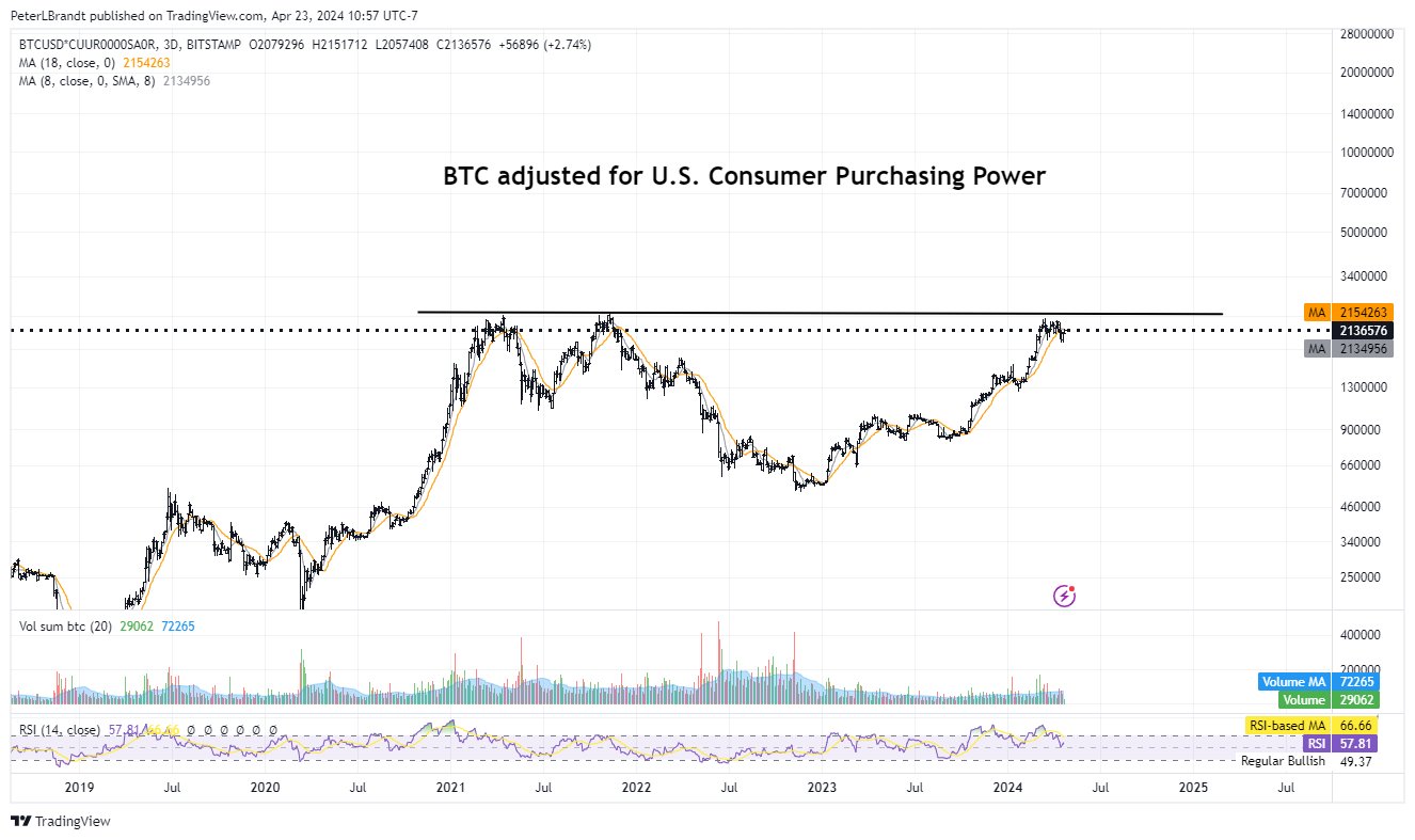 Dựa trên số liệu này, Peter Brandt cho rằng, mặc dù Bitcoin ETF giao ngay đã được phê duyệt và sự kiện halving BTC được ghi nhận gần đây, giá của đồng tiền này vẫn ở mức thấp nếu xét đến sức mua của người tiêu dùng Hoa Kỳ.