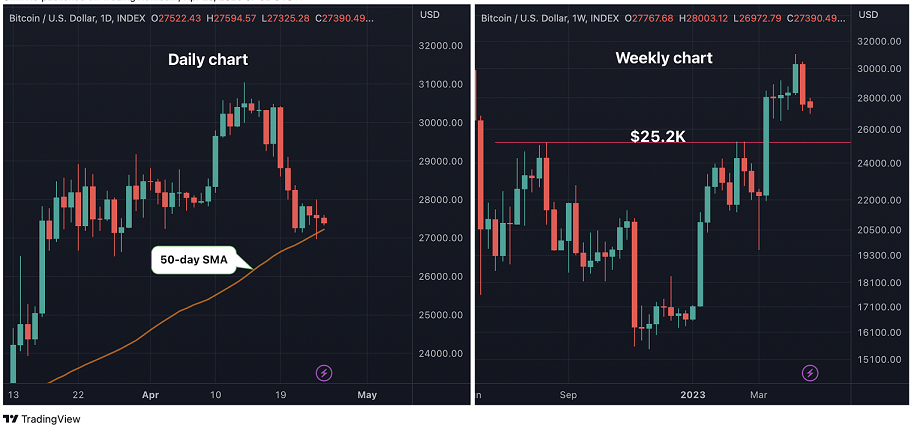 Dữ liệu từ TradingView cho thấy tiền điện tử hàng đầu đang được giao dịch quanh $ 27.400, giảm 11% so với mức đỉnh 10 tháng tại $ 31.000 đạt được vào ngày 14/4. Đà sụt giảm đã thu hút sự chú ý đến đường trung bình động đơn giản 50 ngày (SMA), hiện ở mức $ 27.244.