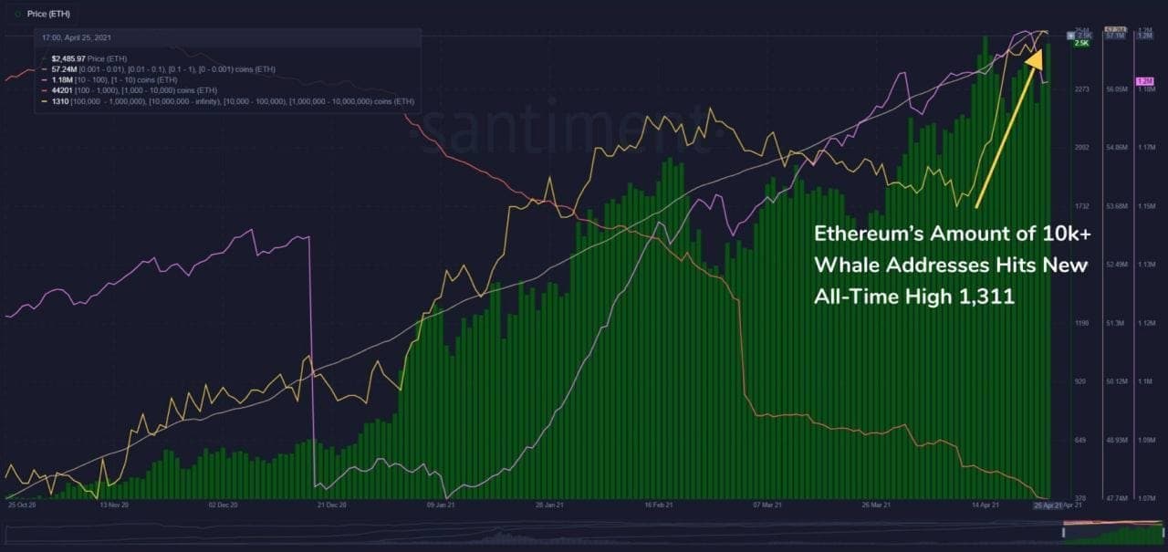 Theo dữ liệu từ công ty phân tích blockchain Santiment, số lượng ví cá voi Ethereum mới (giữ ít nhất 10.000 ETH) đạt mức cao nhất mọi thời đại mới là 1.311 địa chỉ vào cuối tuần trước.