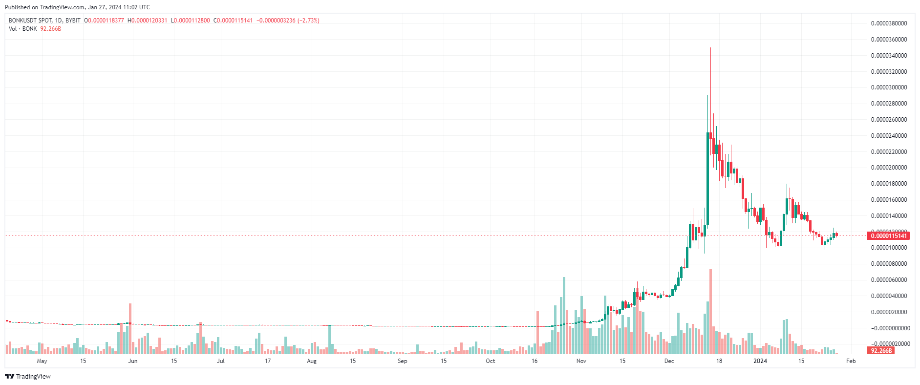 Mặc dù vậy, điều quan trọng cần lưu ý là BONK vẫn giảm hơn 60% so với mức ATH là $ 0,00003416 đạt được khoảng một tháng trước.