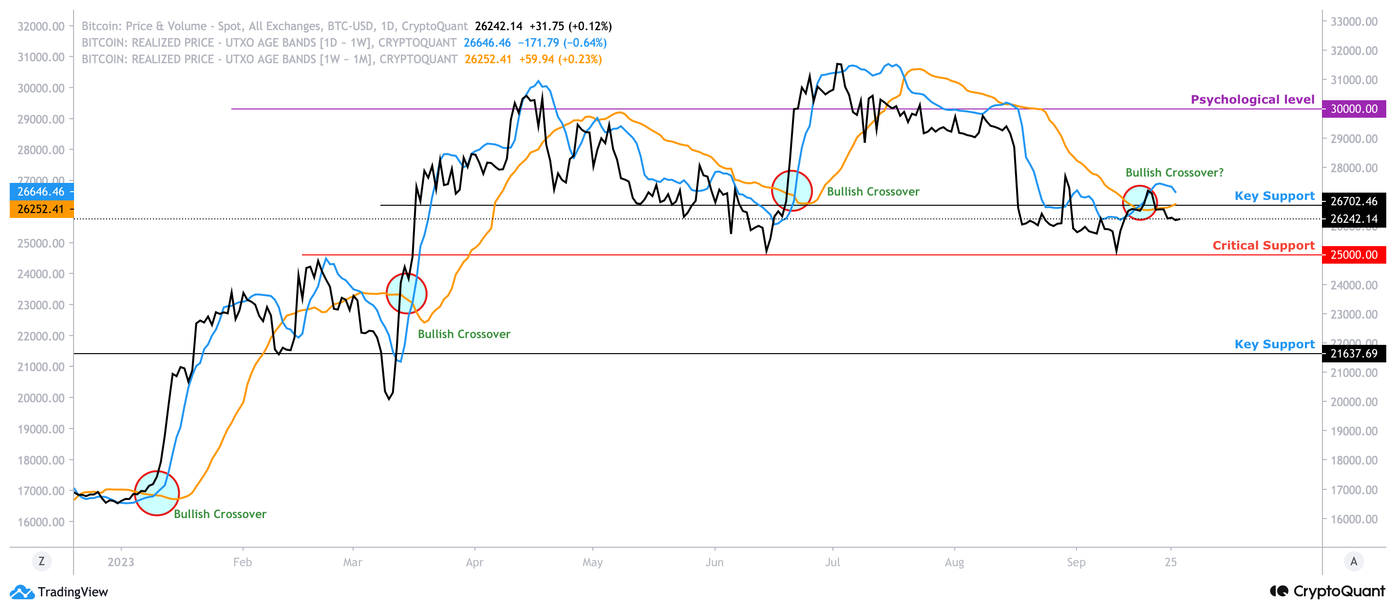 Như đã thấy trong biểu đồ bên dưới, dải UTXO 1 ngày đến 1 tuần vượt qua dải UTXO 1 tuần đến 1 tháng đã tạo ra một đợt tăng giá cho Bitcoin kể từ đầu năm 2023.