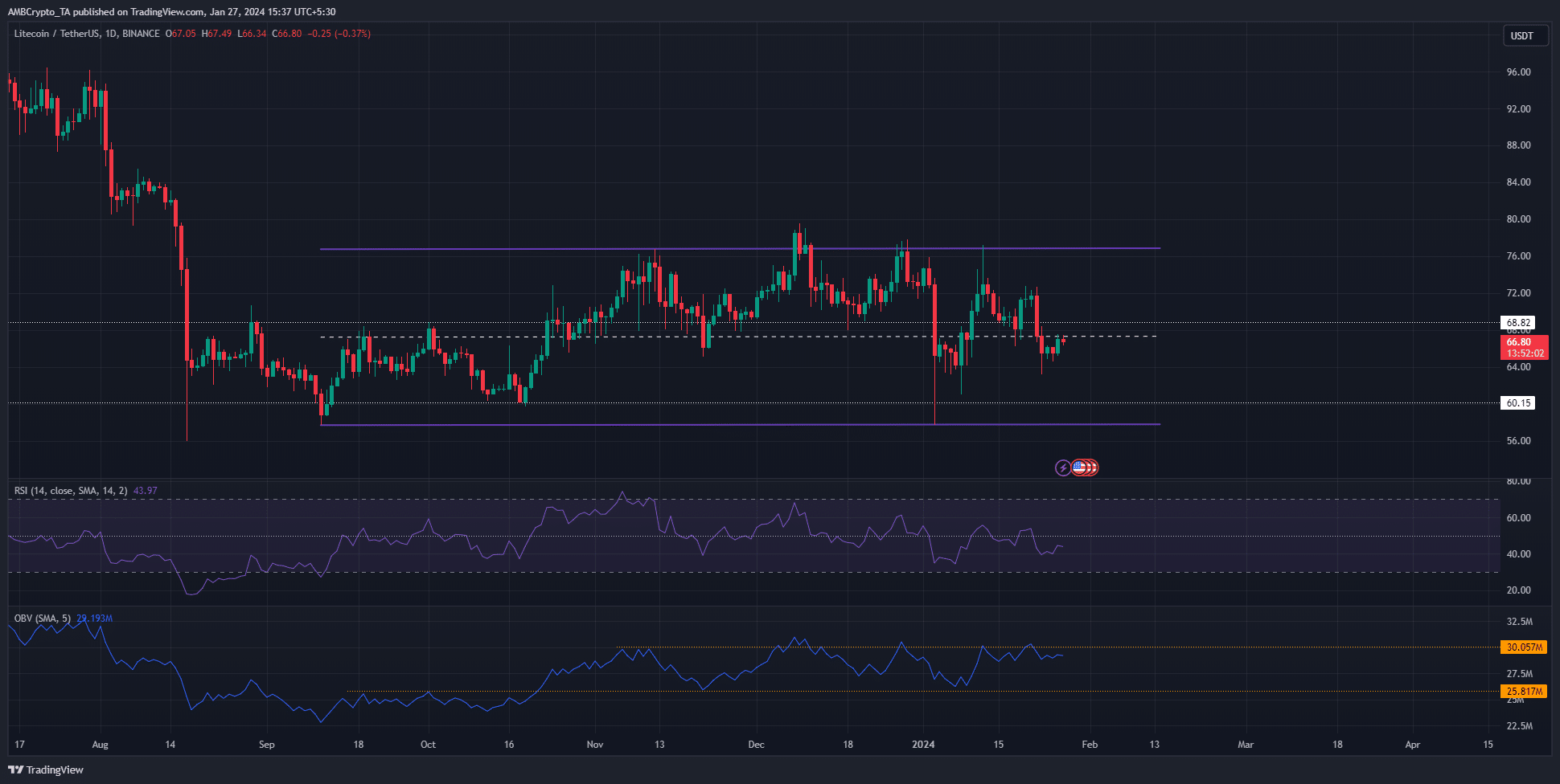 Bên cạnh giá cả, OBV cũng bị kẹt trong phạm vi. Trong khi đó, chỉ báo RSI phản ánh đà giảm cùng với cấu trúc thị trường. Việc leo lên trên mức $ 72,7 sẽ khiến cấu trúc thị trường đi theo hướng ngược lại.