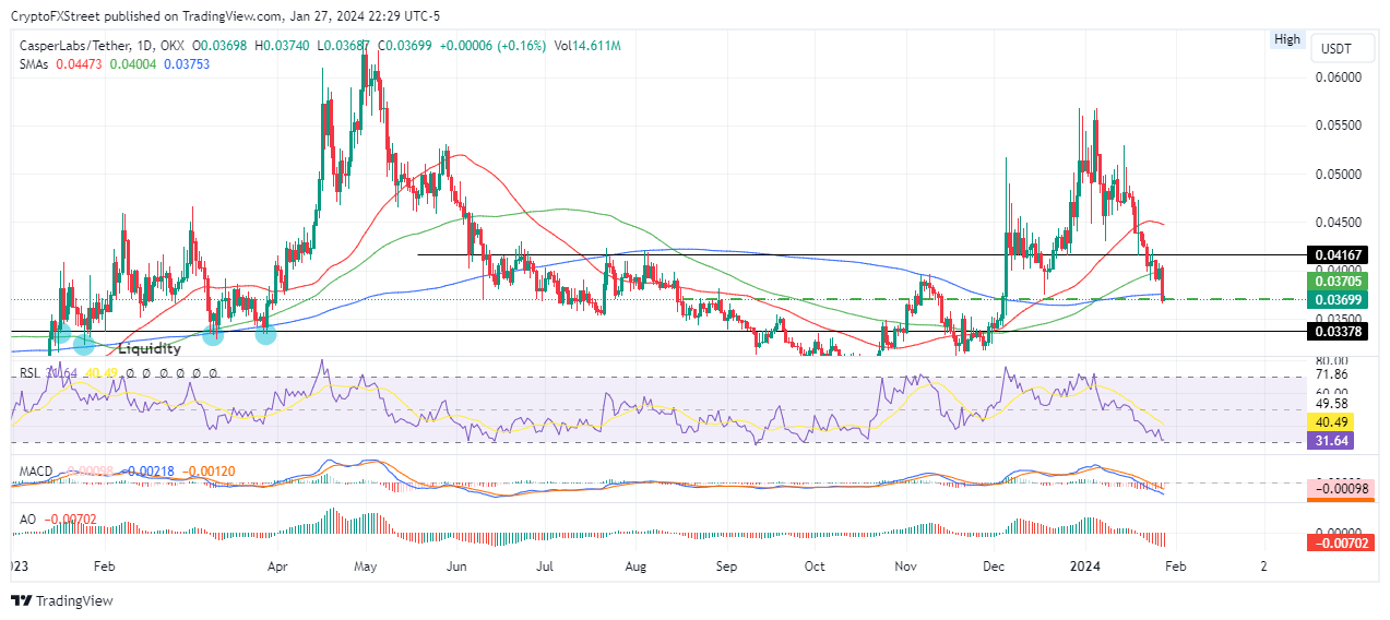 Trong trường hợp tăng giá mạnh, giá Casper có thể tiếp cận đường SMA 50 ngày tại $ 0,0447, tăng cao hơn 20% so với mức hiện tại.