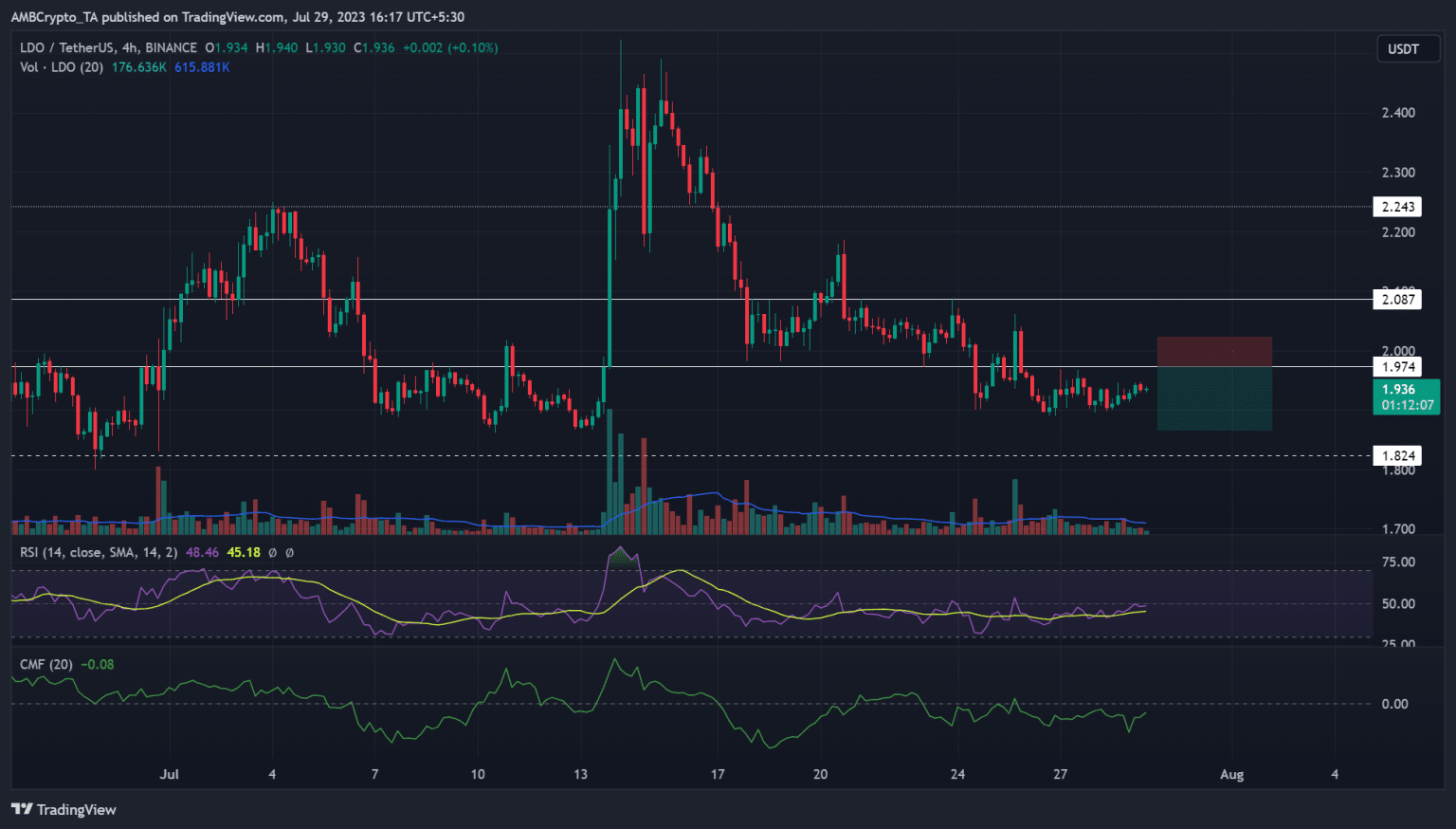 Quay lại với Lido, cấu trúc và động lượng thị trường trên khung thời gian 4 giờ đang giảm, được biểu thị bằng các mức đáy thấp hơn kể từ giữa tháng 7. Với BTC yếu, hành động giá của LDO có thể bị đình trệ ở mức kháng cự $ 1,97.
