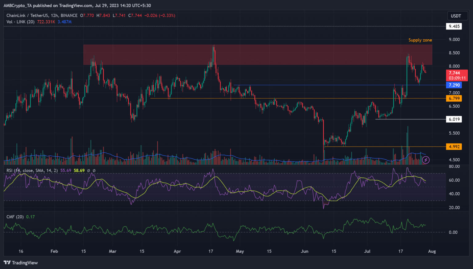 Sự phục hồi của LINK đã đảo ngược tất cả các khoản lỗ trong quý 2 khi chạm vào vùng cung một lần nữa. Sau một lần từ chối gần đây, đợt thoái lui đầu tiên đã chứng kiến LINK quay về mức $ 7,3. Nhưng sự phục hồi của altcoin đã phải đối mặt với một sự từ chối khác tại vùng cung gần $ 8.