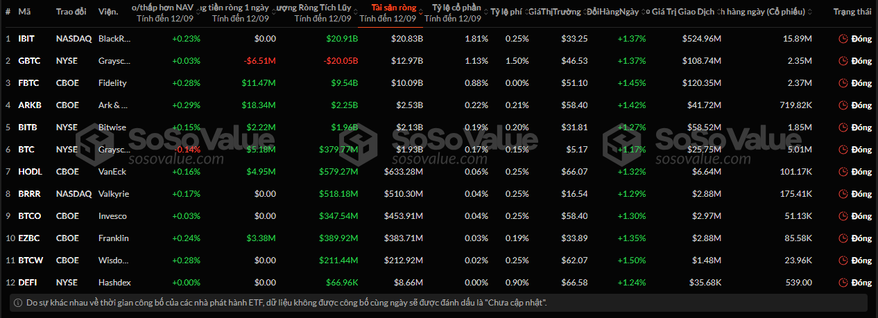 Vào ngày 12 tháng 9, tổng dòng tiền ròng chảy vào các quỹ ETF giao ngay Bitcoin là 39,0239 triệu USD.