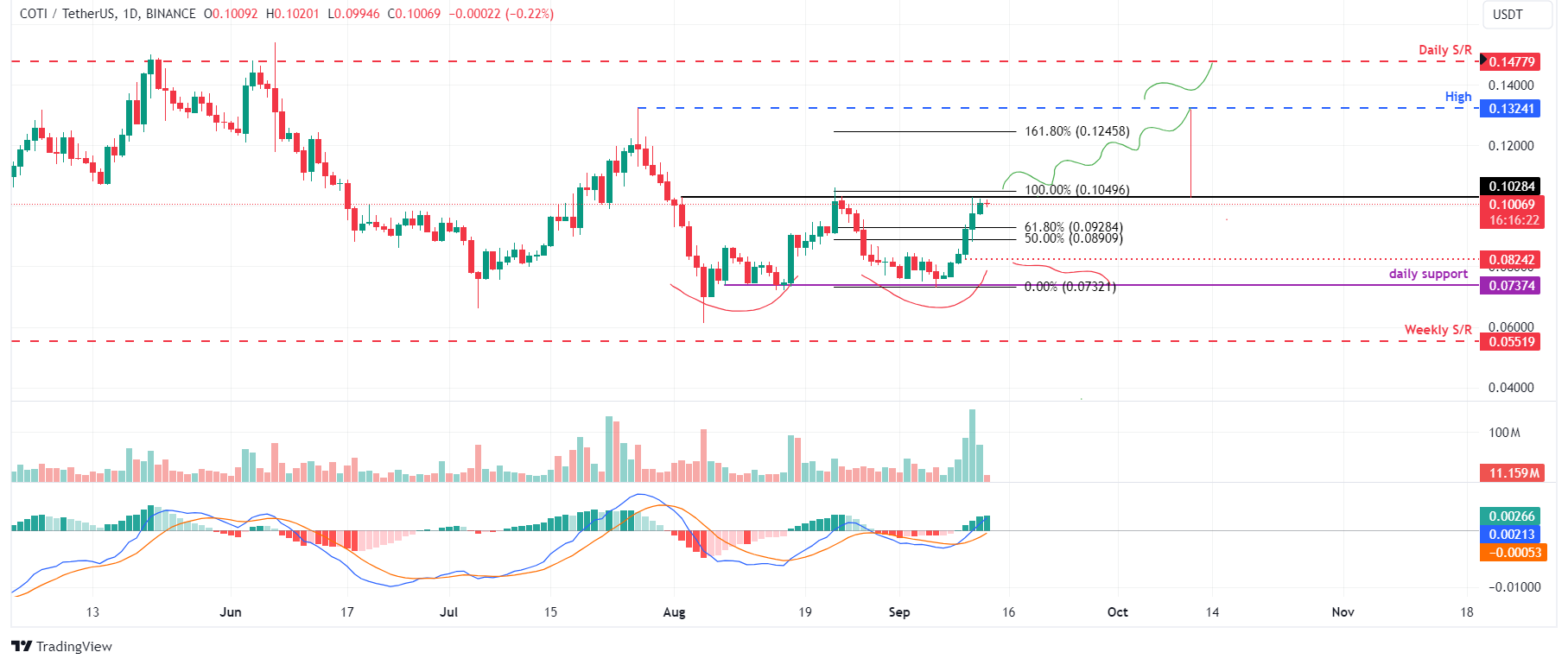 Giá COTI tăng và đóng cửa ở mức $0,102 vào giữa tháng 8 sau khi bật lên từ mức $0,073. Từ đầu tháng 8 đến đầu tháng 9, nó hình thành cấu trúc chữ W được gọi là mô hình đáy đôi, thường báo hiệu sự đảo ngược xu hướng tiềm năng có lợi cho phe mua. Tại thời điểm hiện tại, nó đang tiến gần đến mức breakout $0,101, còn được gọi là đường viền cổ.