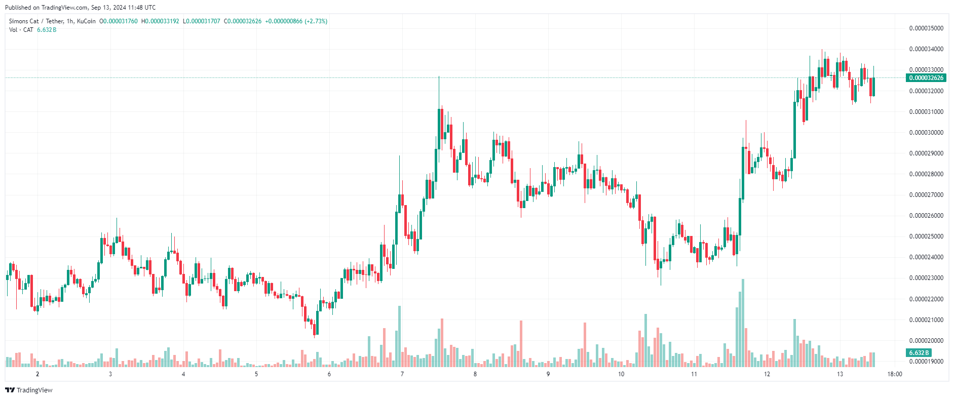 Simon’s Cat (CAT), memecoin được ra mắt trên BNB Chain vào ngày 22 tháng 8, đã cho thấy hiệu suất khá ấn tượng. Giá của nó đã tăng 70% trong hai tuần, đạt mức đỉnh kỷ lục mới tại $0,00003355 vào đầu ngày hôm nay.