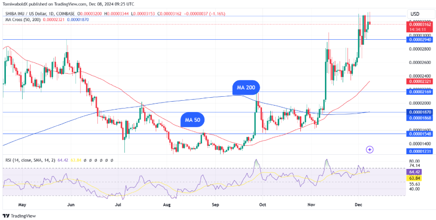 Mức $0,000033 vẫn đang là ngưỡng kháng cự mạnh vì đà tăng của SHIB đã dừng lại tại đây vào ngày 1 và 4 tháng 12, khiến đây trở thành điểm kháng cự quan trọng mà trader và nhà đầu tư đang theo dõi.